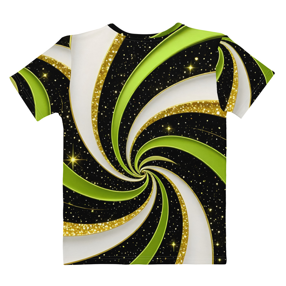 The REJEY Cosmic Spiral All-Over Print T-Shirt captures perpetual motion in wearable form. Featuring a mesmerizing spiral design in electric lime green, crisp white, and shimmering gold accents against a starlit black canvas, this piece embodies infinite possibility and forward momentum.