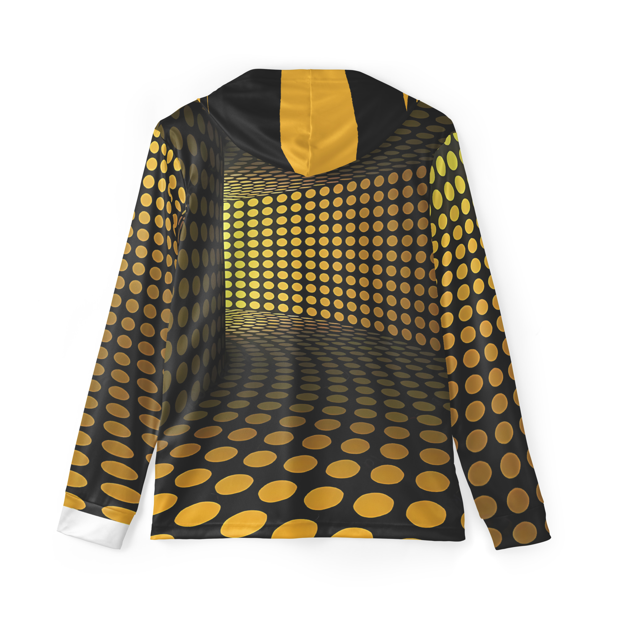 The REJEY Dimensional Grid All-Over Print Men’s Sports Warmup Hoodie combines optical illusion with high-performance functionality. Featuring a striking 3D dot pattern in metallic gold against deep black, this design creates the illusion of curved surfaces and infinite depth—as if you’re looking through dimensional portals with every shift in perspective.