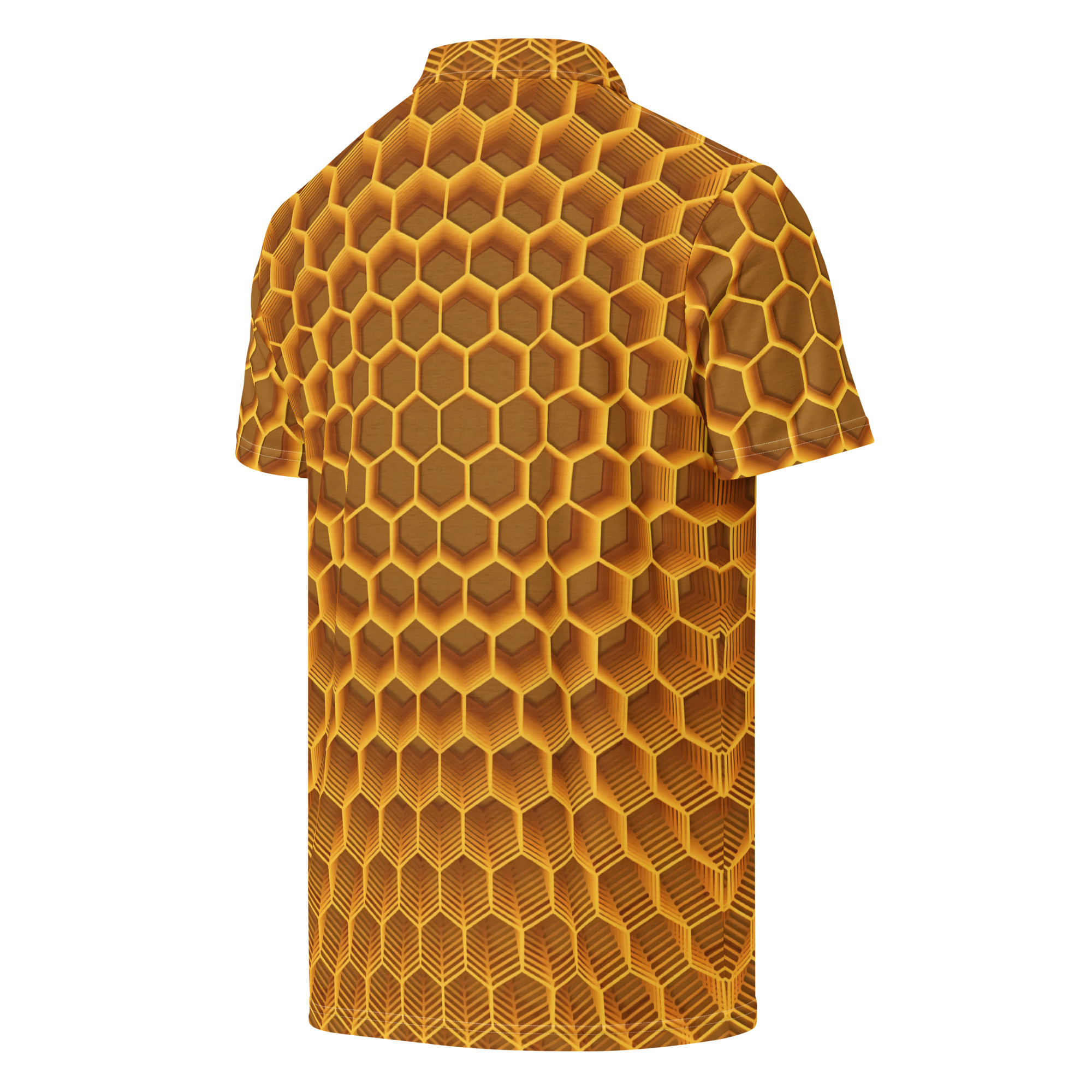 Each hexagonal cell appears to recede into the fabric with realistic shadows and highlights, creating a tactile illusion of textured surfaces. The pattern flows seamlessly across the front, back, and sleeves, ensuring a polished look from every angle. This isn’t just elevated casual wear—it’s a tribute to nature’s perfect design and the power of strategic structure.