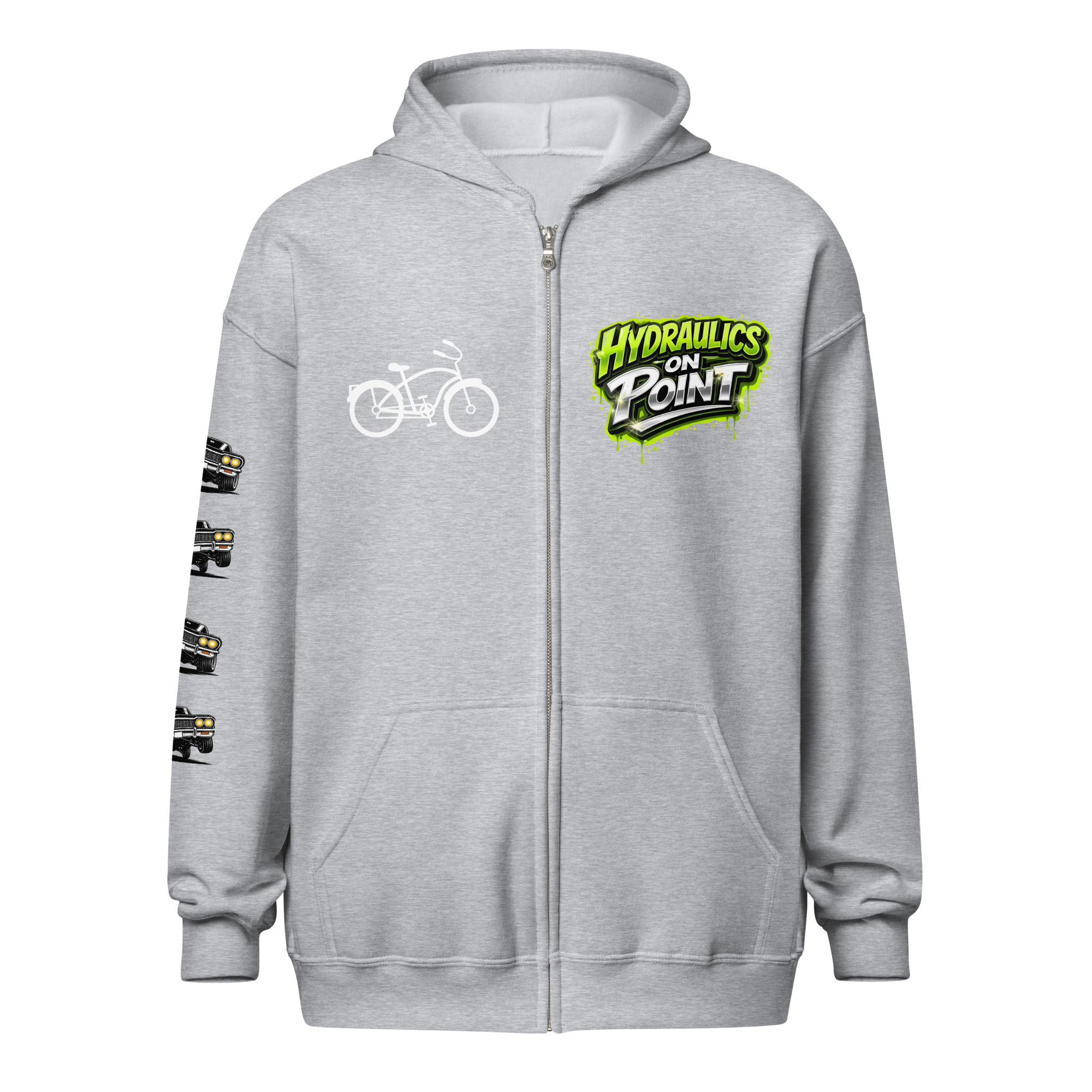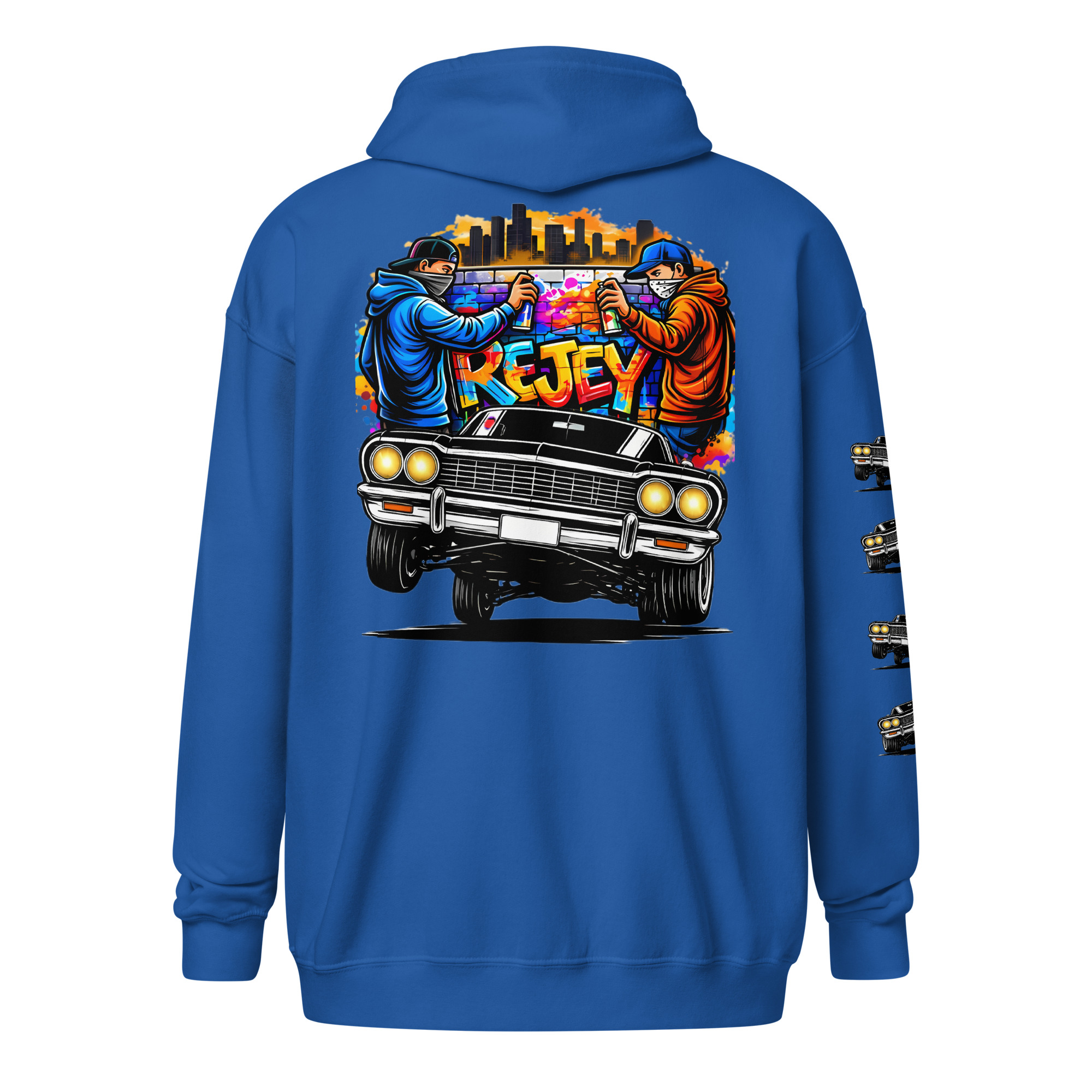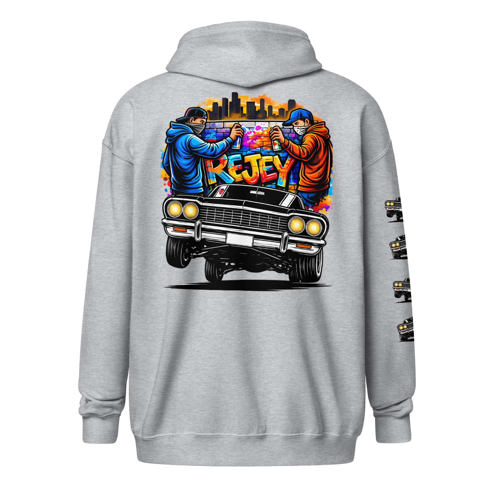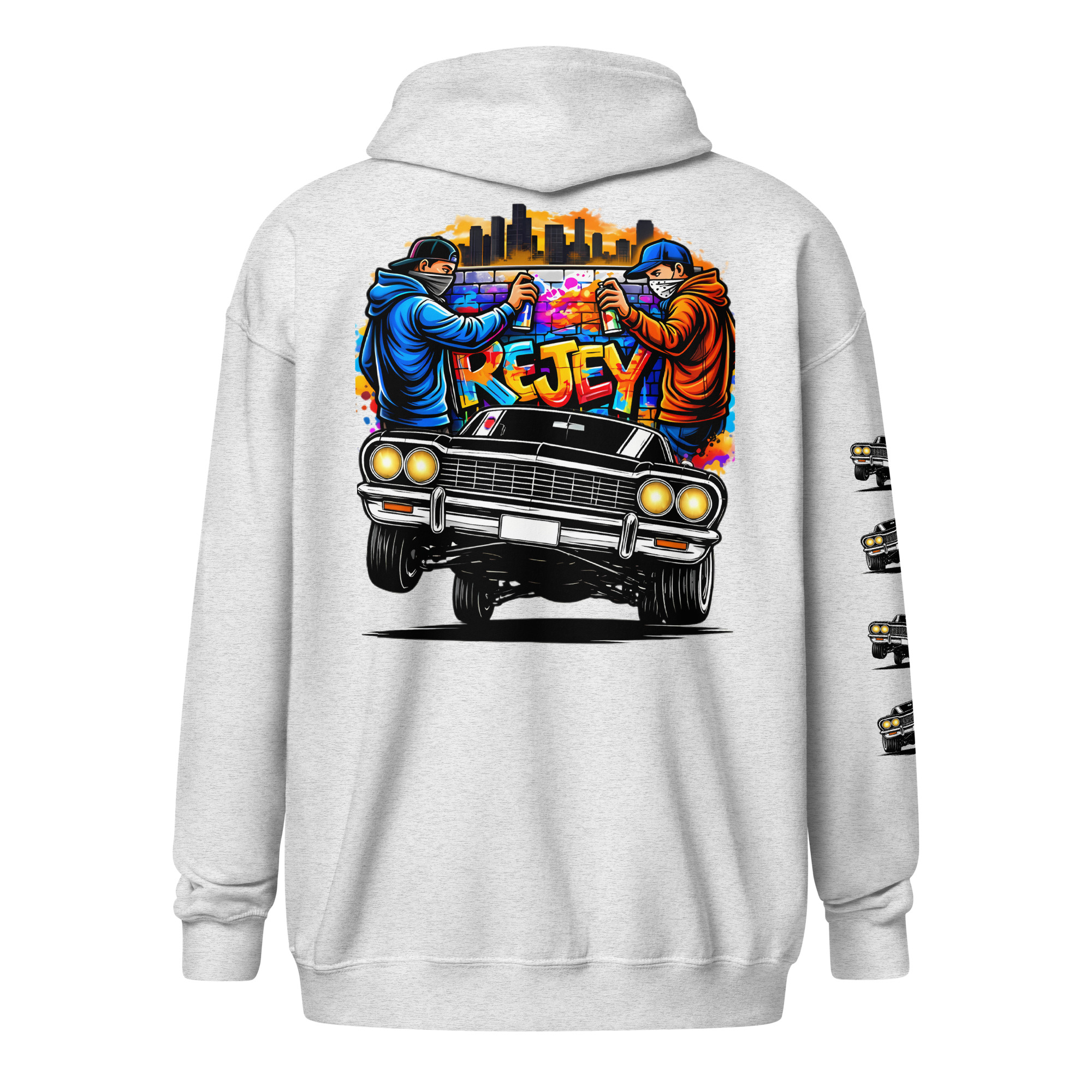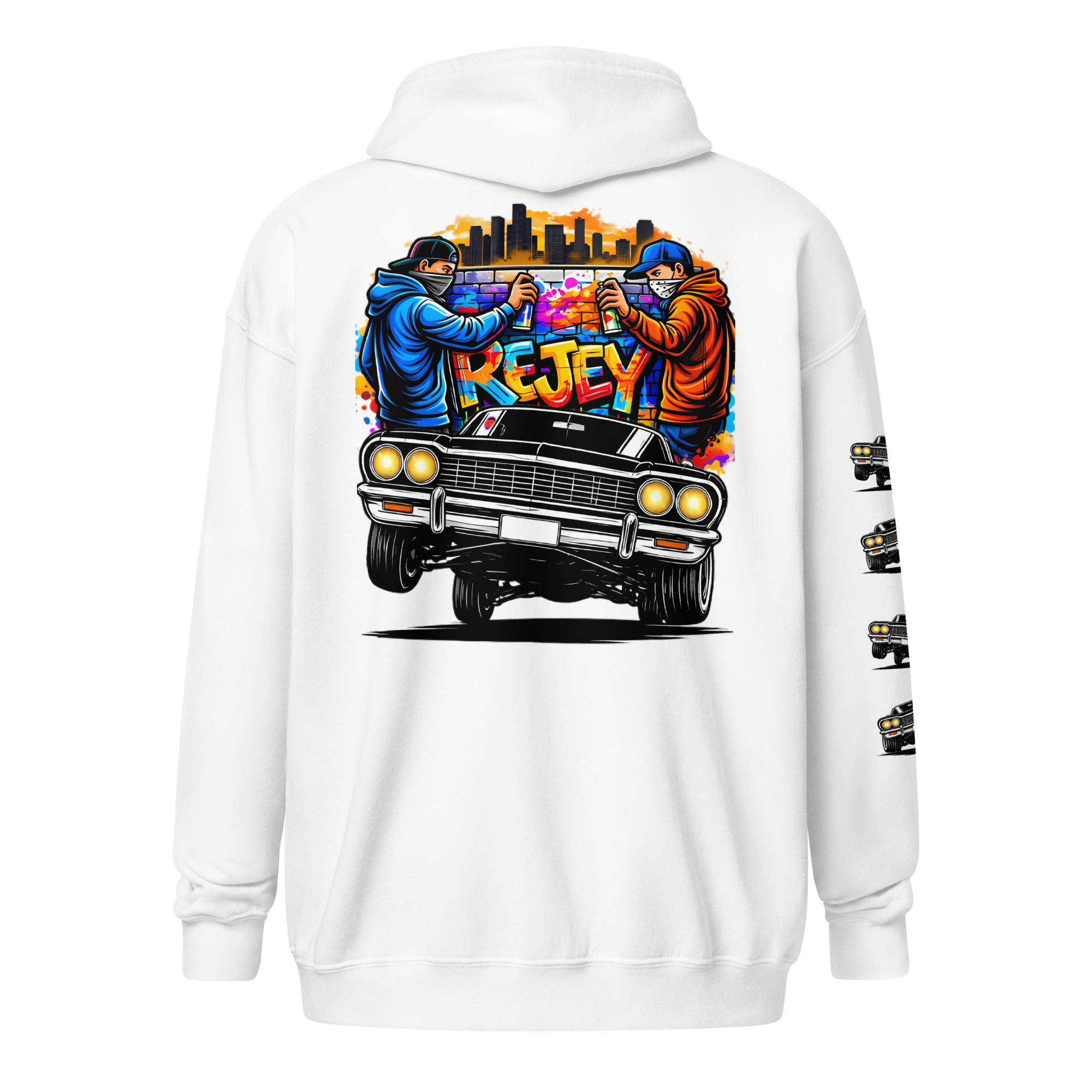 The REJEY Hydraulics On Point Zip Hoodie brings West Coast lowrider culture to life with vibrant street art energy. Featuring a white cruiser bike graphic and “HYDRAULICS ON POINT” logo in electric lime green graffiti lettering on the chest, a dynamic back graphic showcasing graffiti artists painting “REJEY” over a bouncing lowrider against an urban skyline, and repeating chrome lowrider graphics on the left sleeve, this hoodie is a complete statement piece.