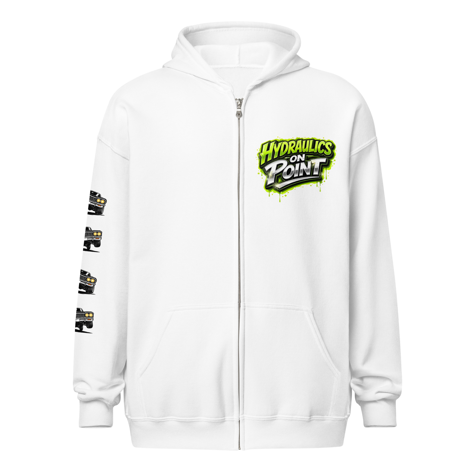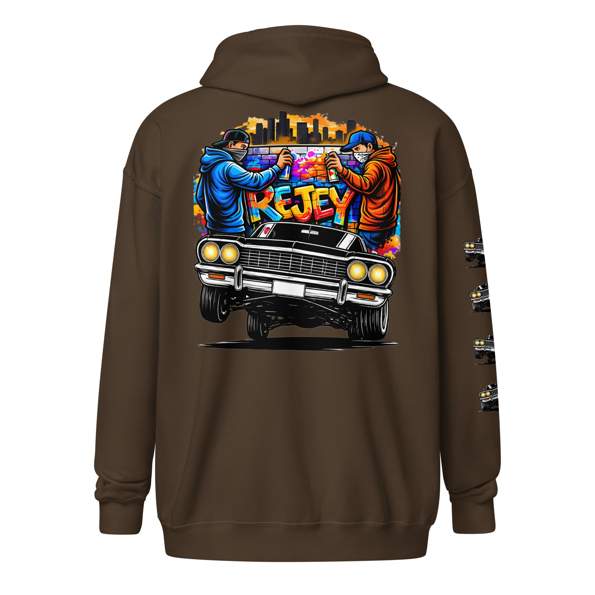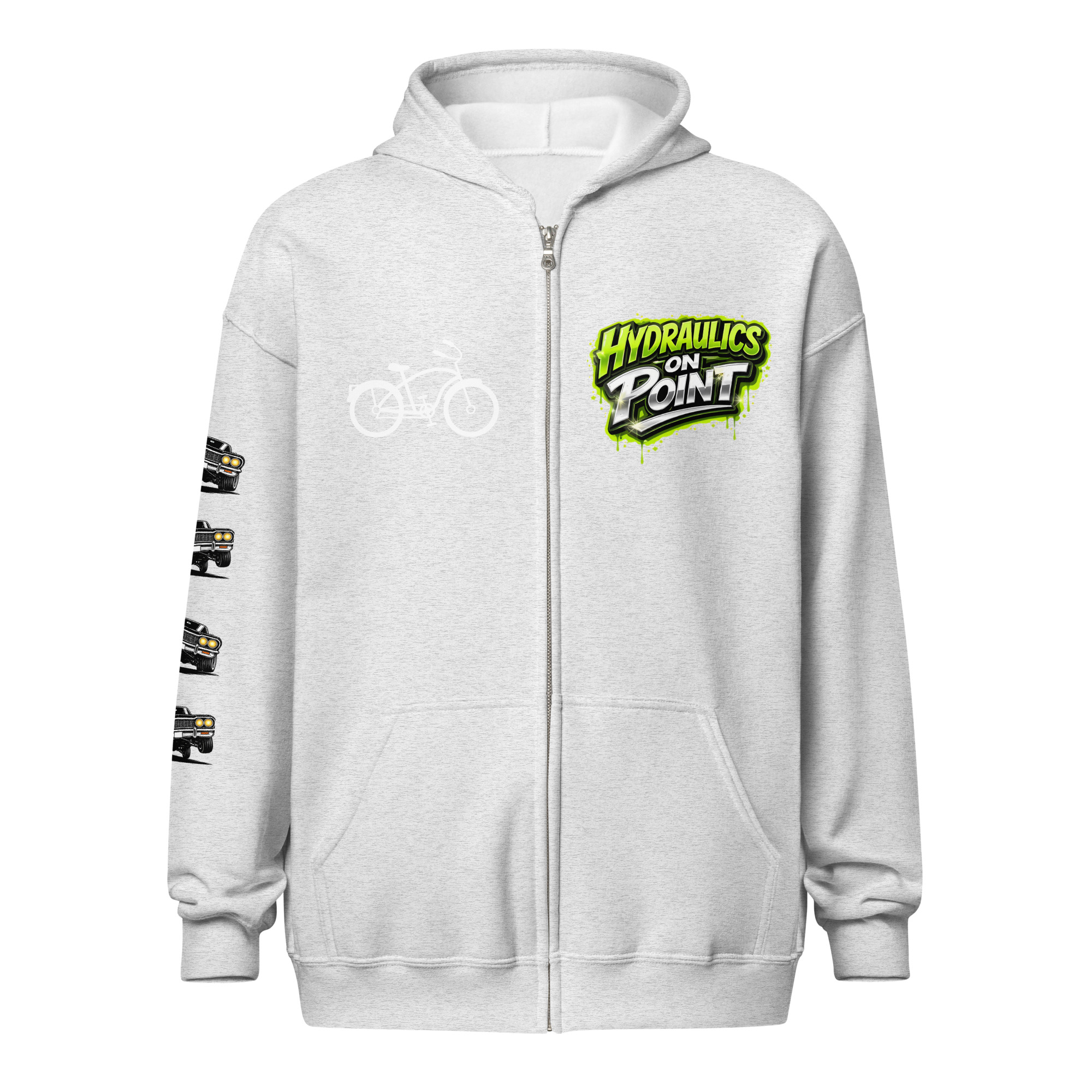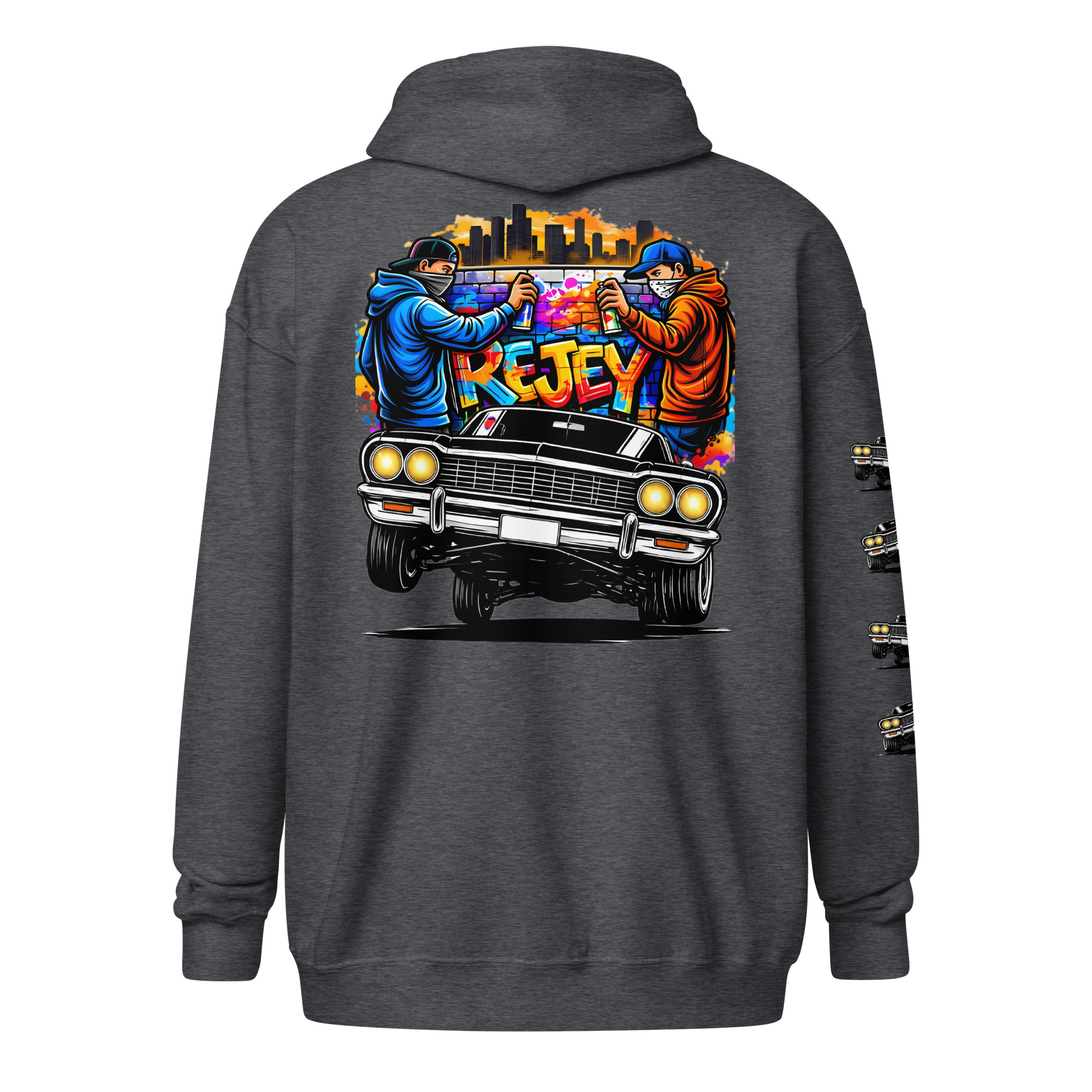 The REJEY Hydraulics On Point Zip Hoodie brings West Coast lowrider culture to life with vibrant street art energy. Featuring a white cruiser bike graphic and “HYDRAULICS ON POINT” logo in electric lime green graffiti lettering on the chest, a dynamic back graphic showcasing graffiti artists painting “REJEY” over a bouncing lowrider against an urban skyline, and repeating chrome lowrider graphics on the left sleeve, this hoodie is a complete statement piece.