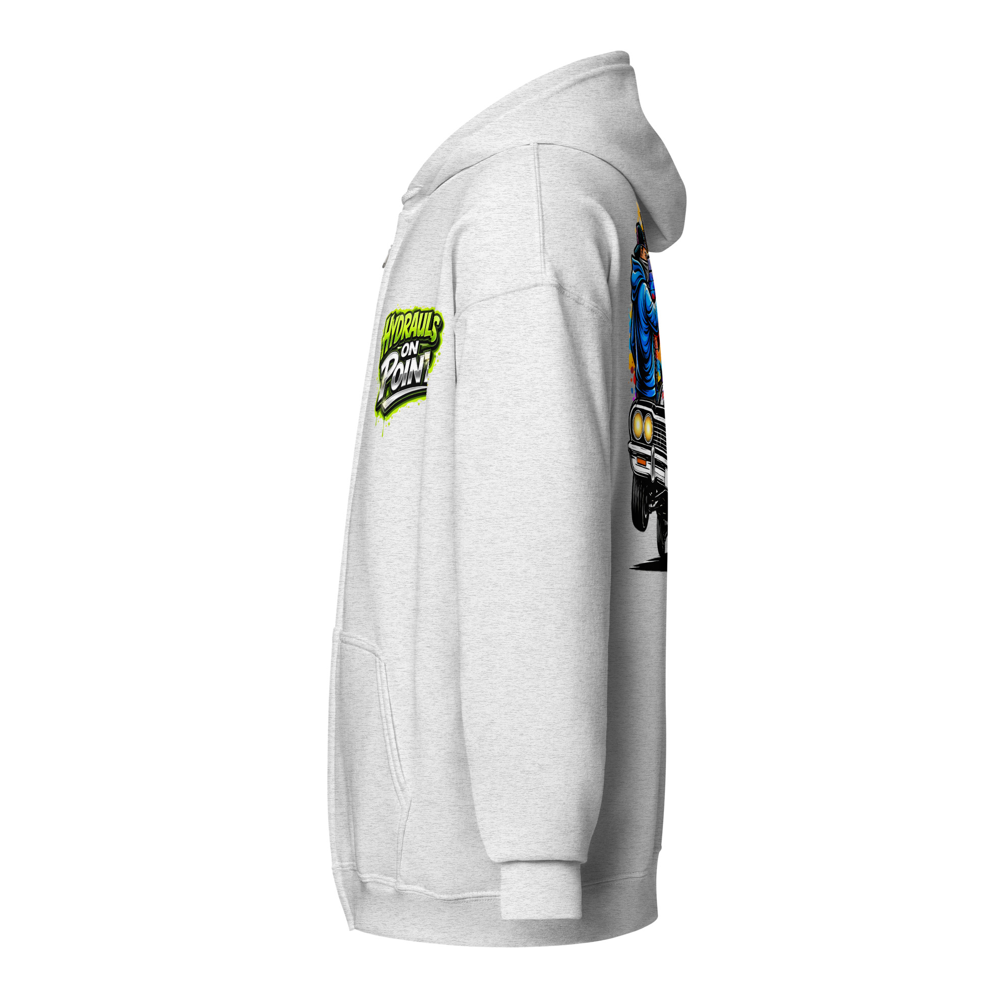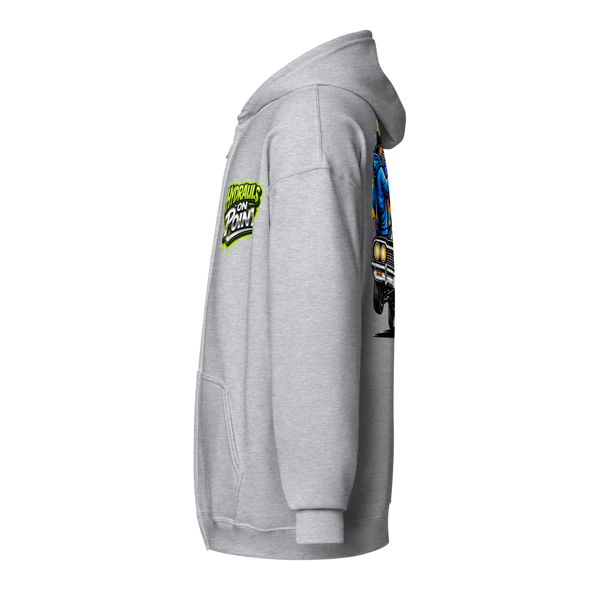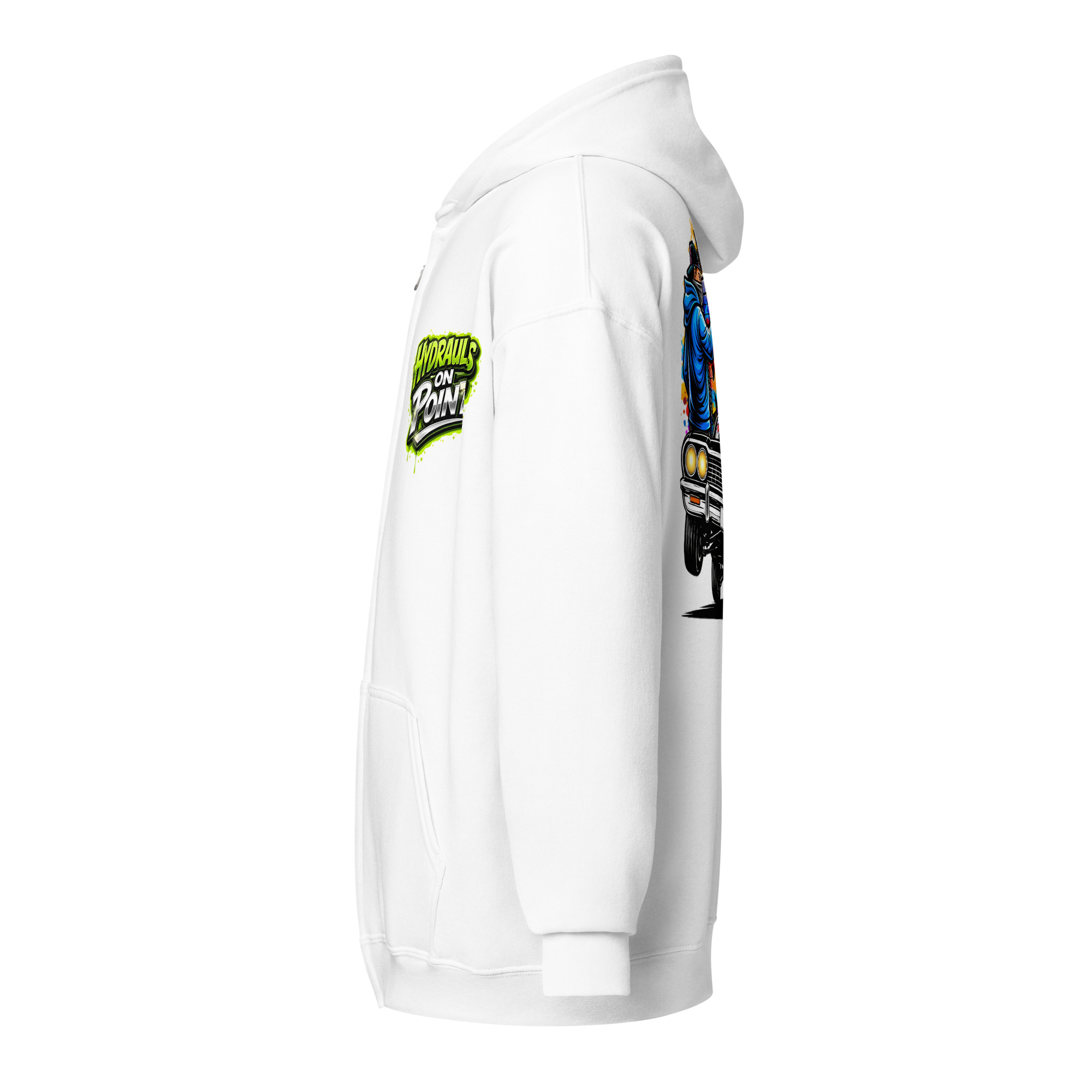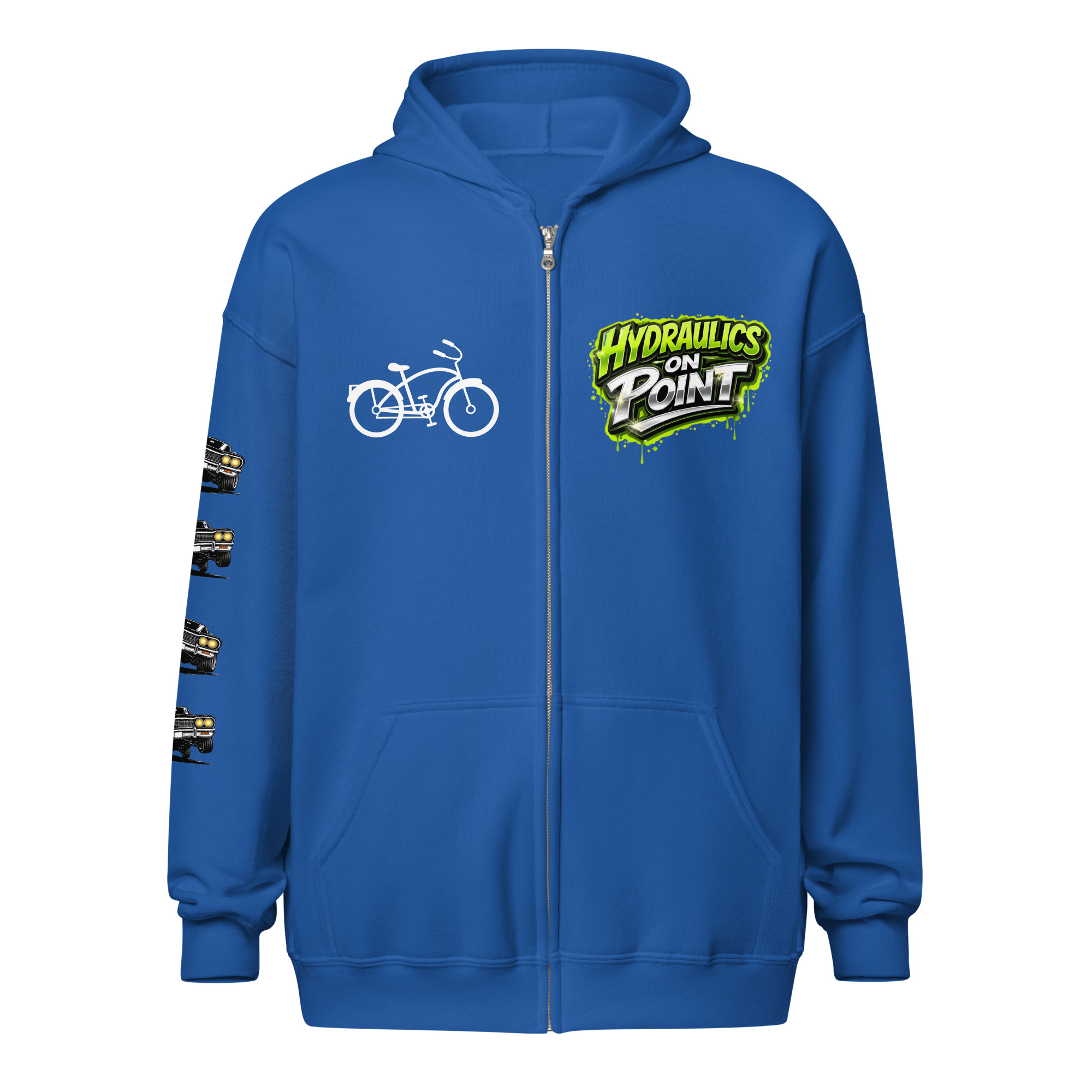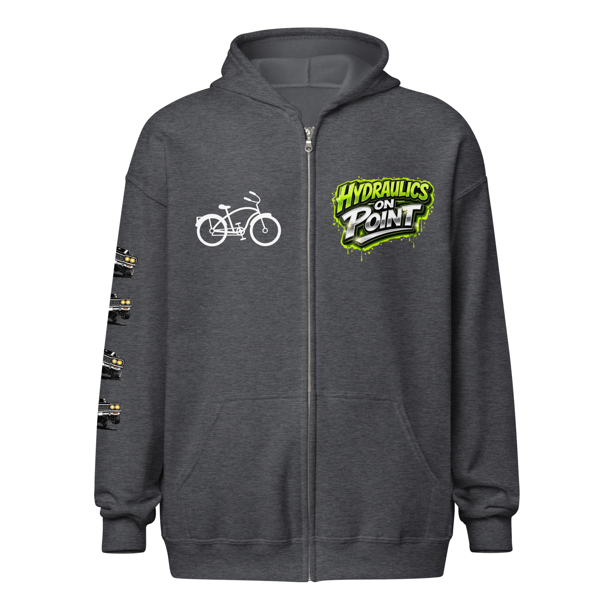 The REJEY Hydraulics On Point Zip Hoodie brings West Coast lowrider culture to life with vibrant street art energy. Featuring a white cruiser bike graphic and “HYDRAULICS ON POINT” logo in electric lime green graffiti lettering on the chest, a dynamic back graphic showcasing graffiti artists painting “REJEY” over a bouncing lowrider against an urban skyline, and repeating chrome lowrider graphics on the left sleeve, this hoodie is a complete statement piece.