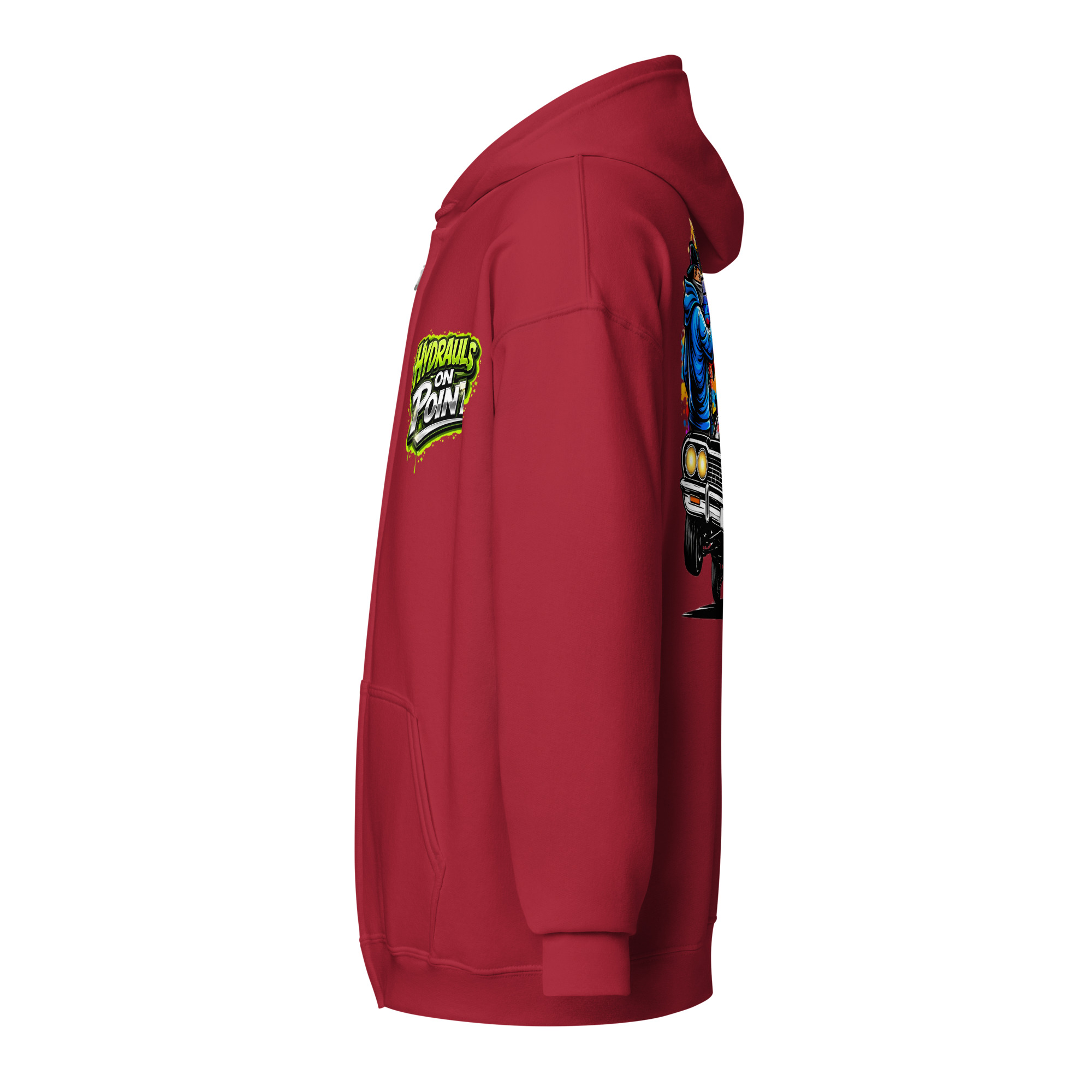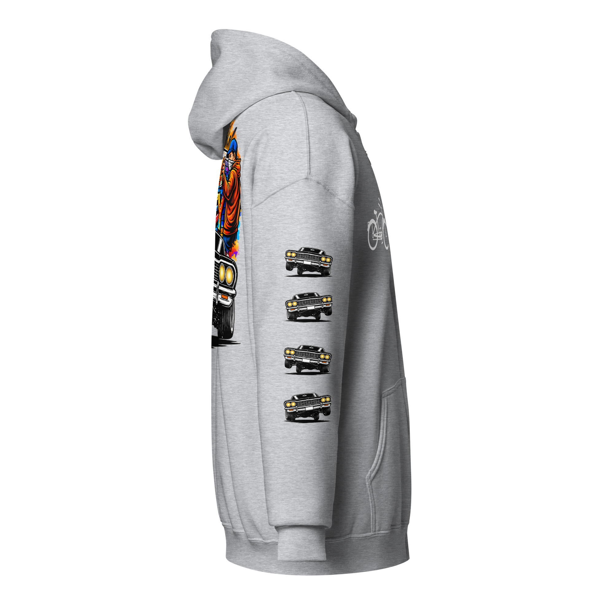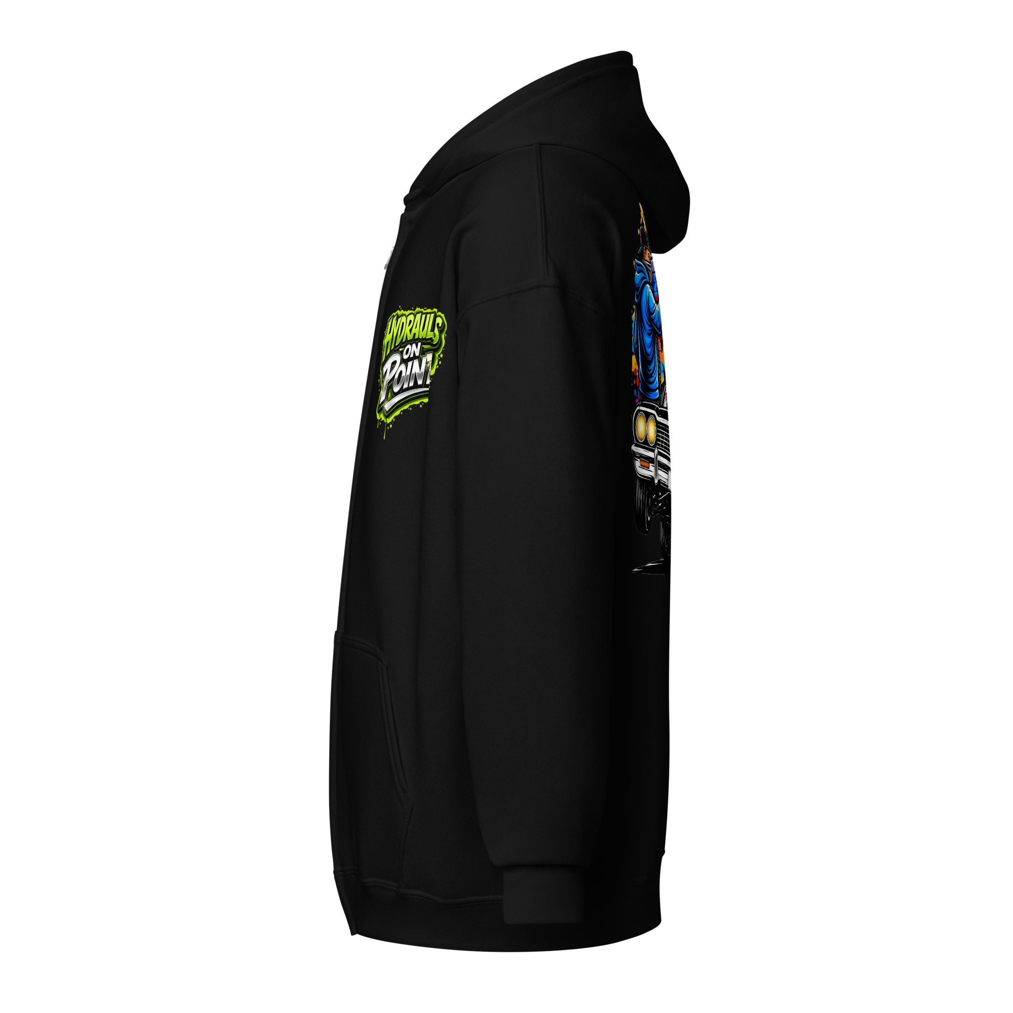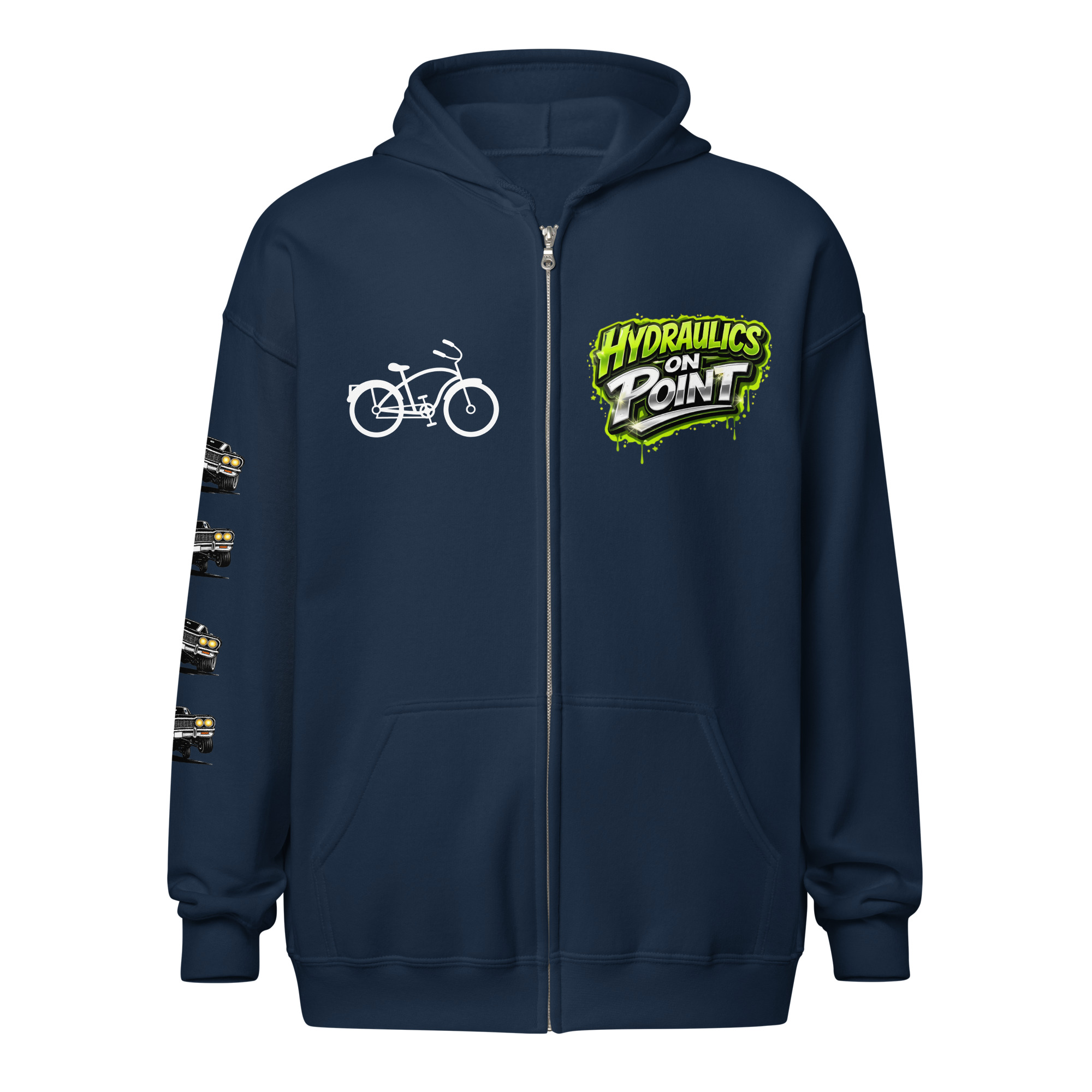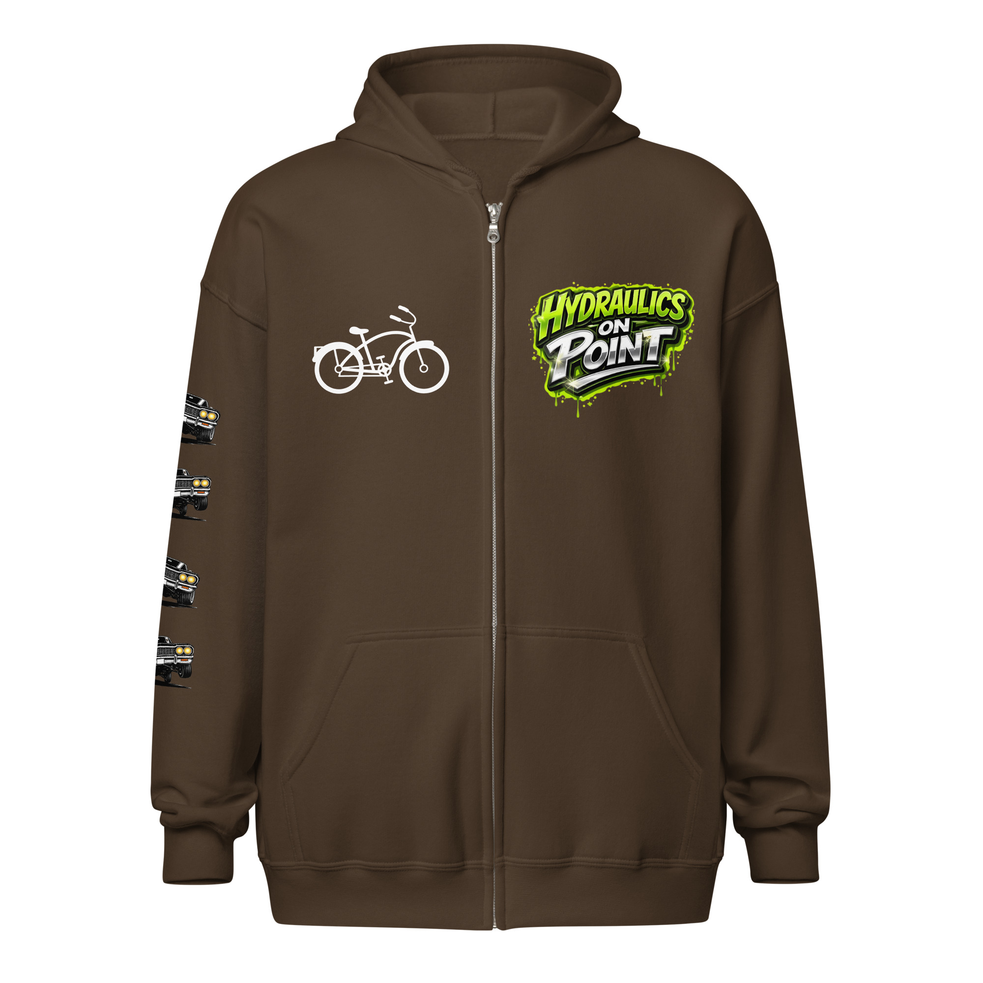 The REJEY Hydraulics On Point Zip Hoodie brings West Coast lowrider culture to life with vibrant street art energy. Featuring a white cruiser bike graphic and “HYDRAULICS ON POINT” logo in electric lime green graffiti lettering on the chest, a dynamic back graphic showcasing graffiti artists painting “REJEY” over a bouncing lowrider against an urban skyline, and repeating chrome lowrider graphics on the left sleeve, this hoodie is a complete statement piece.