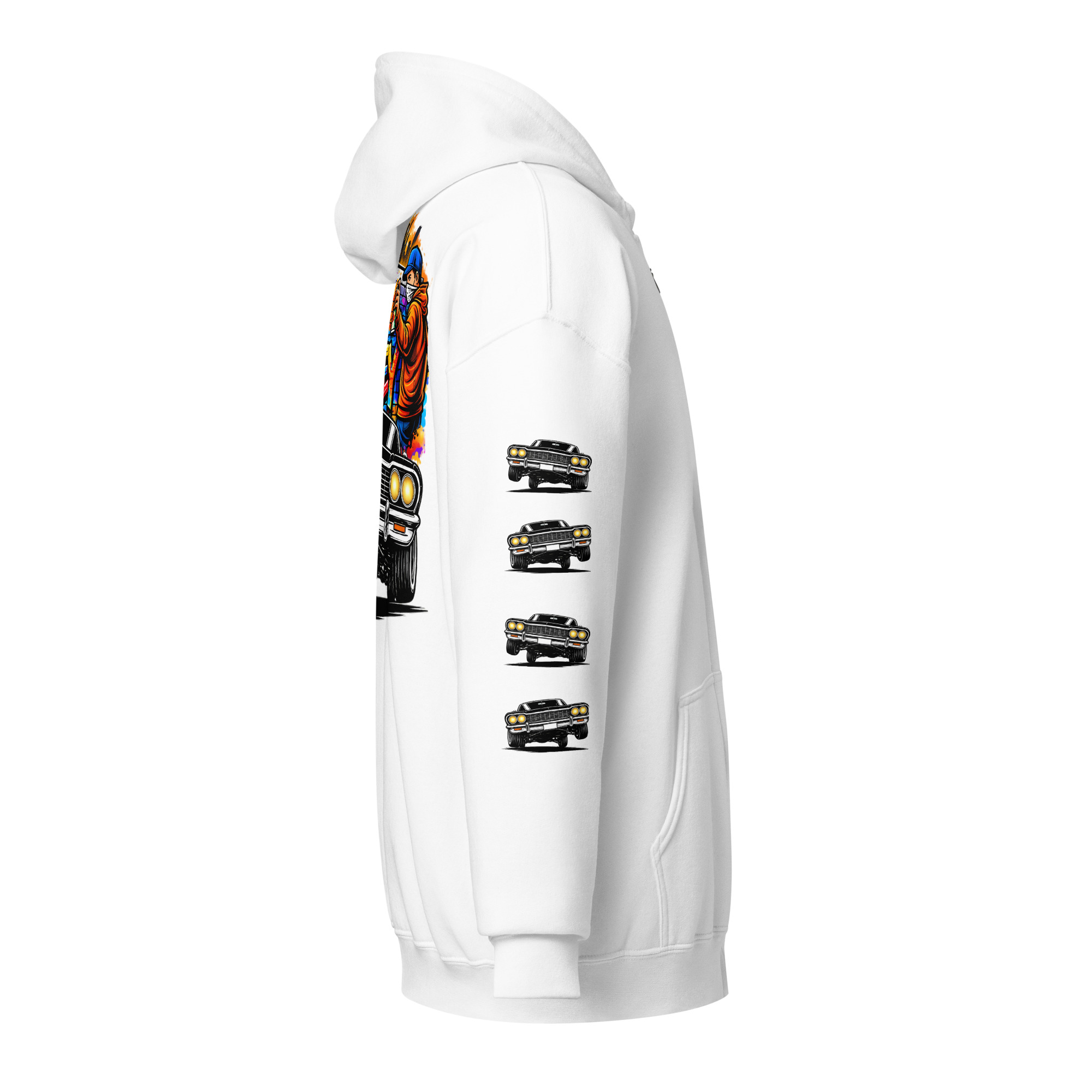 Full-color back graphic: graffiti artists, lowrider, urban skyline