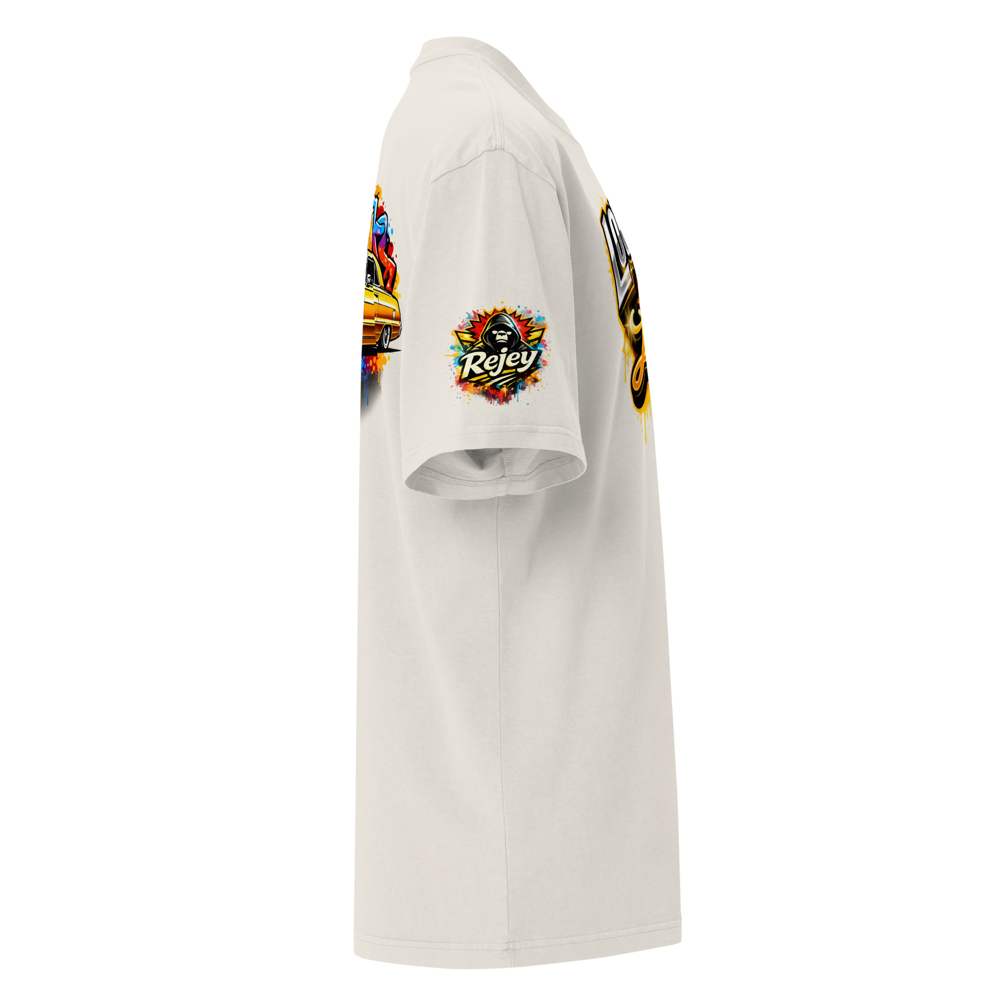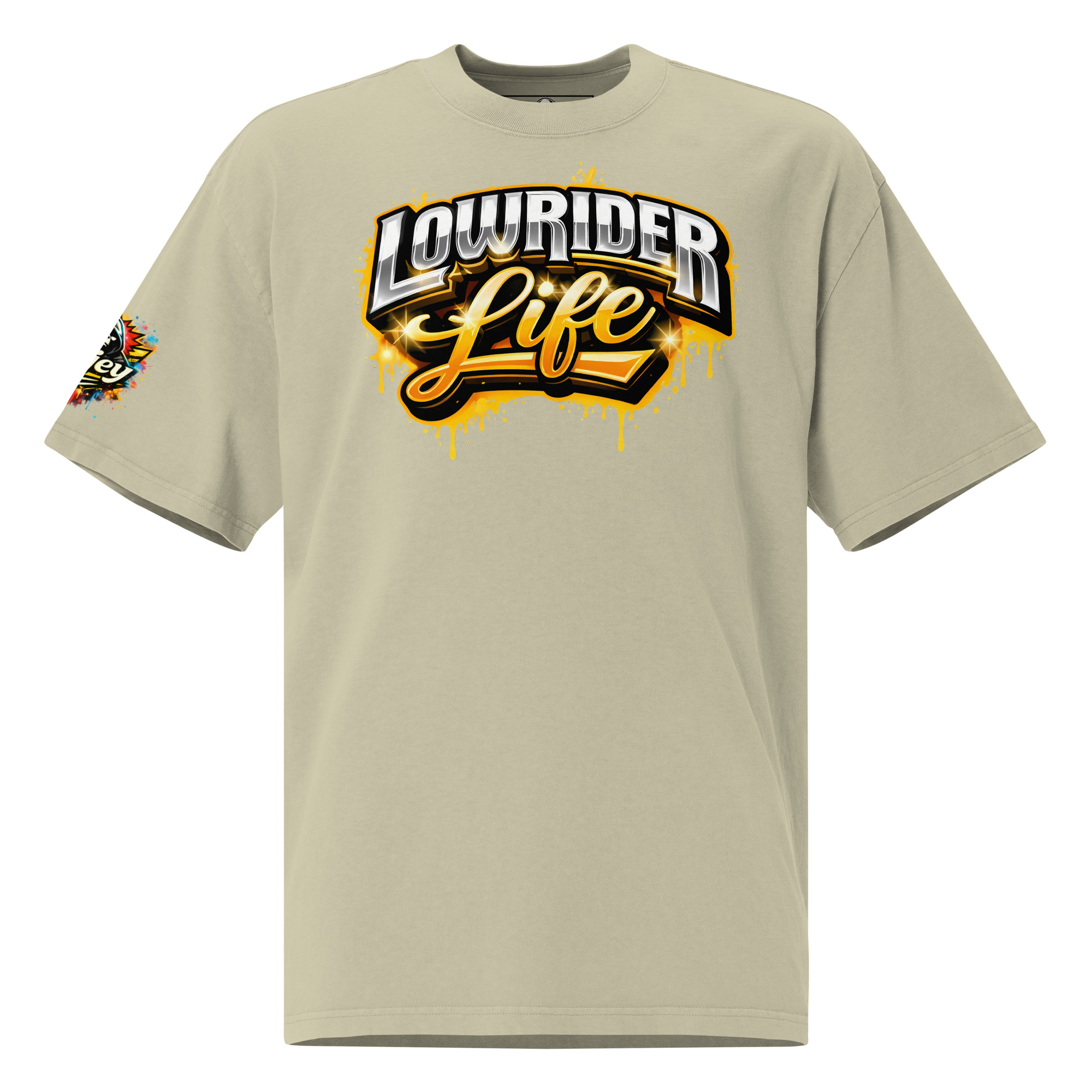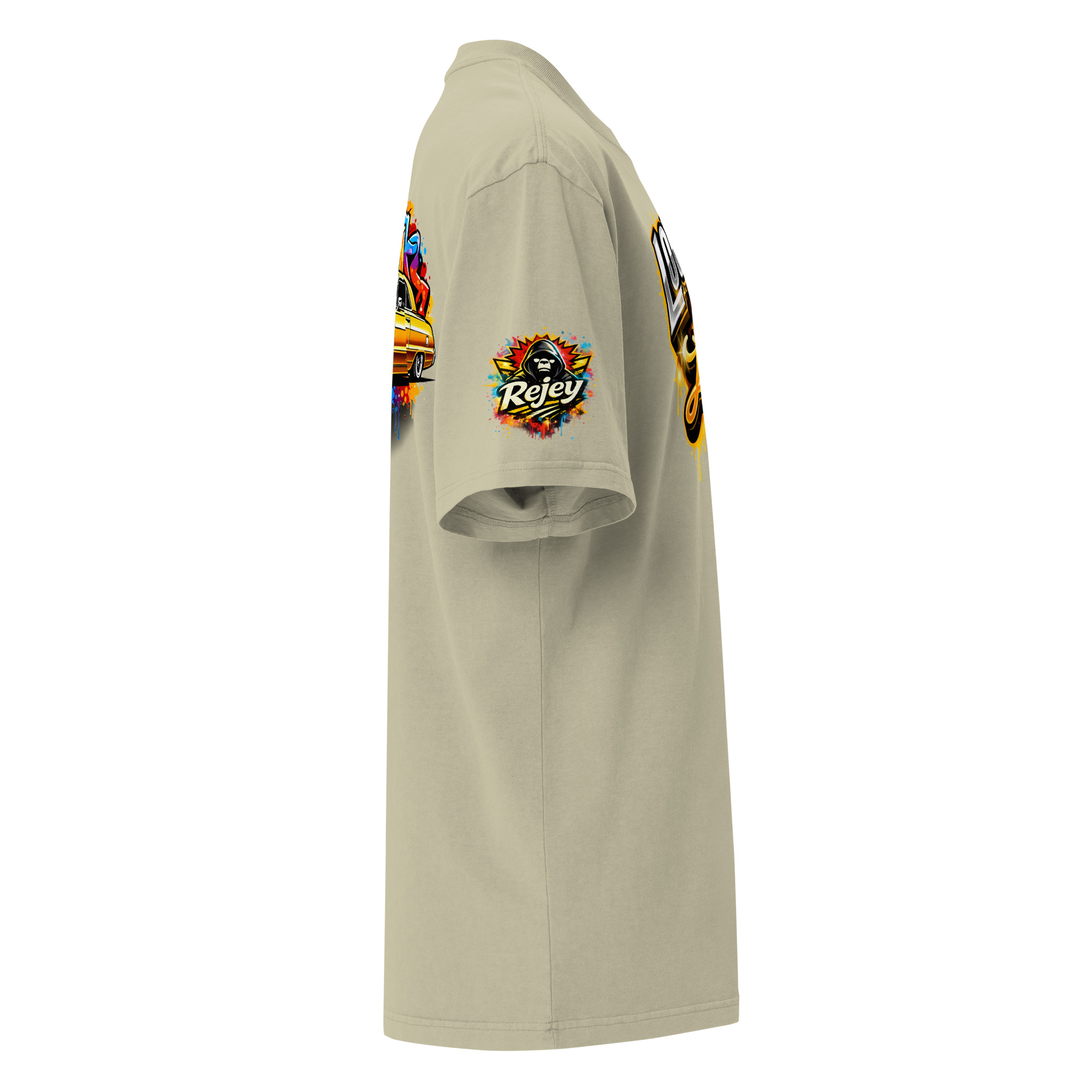 The REJEY Lowrider Life Oversized Faded T-Shirt celebrates automotive heritage and West Coast street culture with authentic style. Featuring a bold “LOWRIDER LIFE” graphic on the chest in metallic chrome and gold lettering with graffiti-style drip effects, a vibrant graffiti art lowrider on the back, and REJEY branding on the left sleeve, this tee brings classic car culture to life with modern streetwear edge.