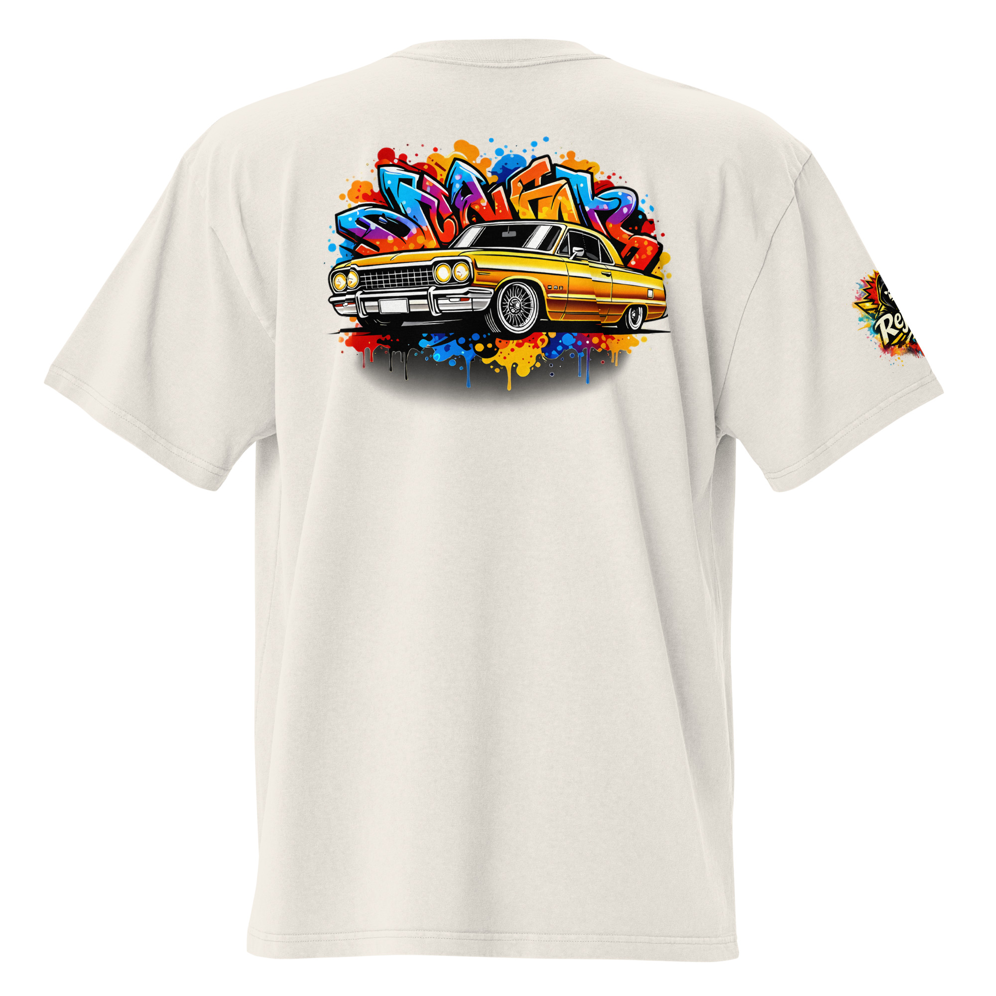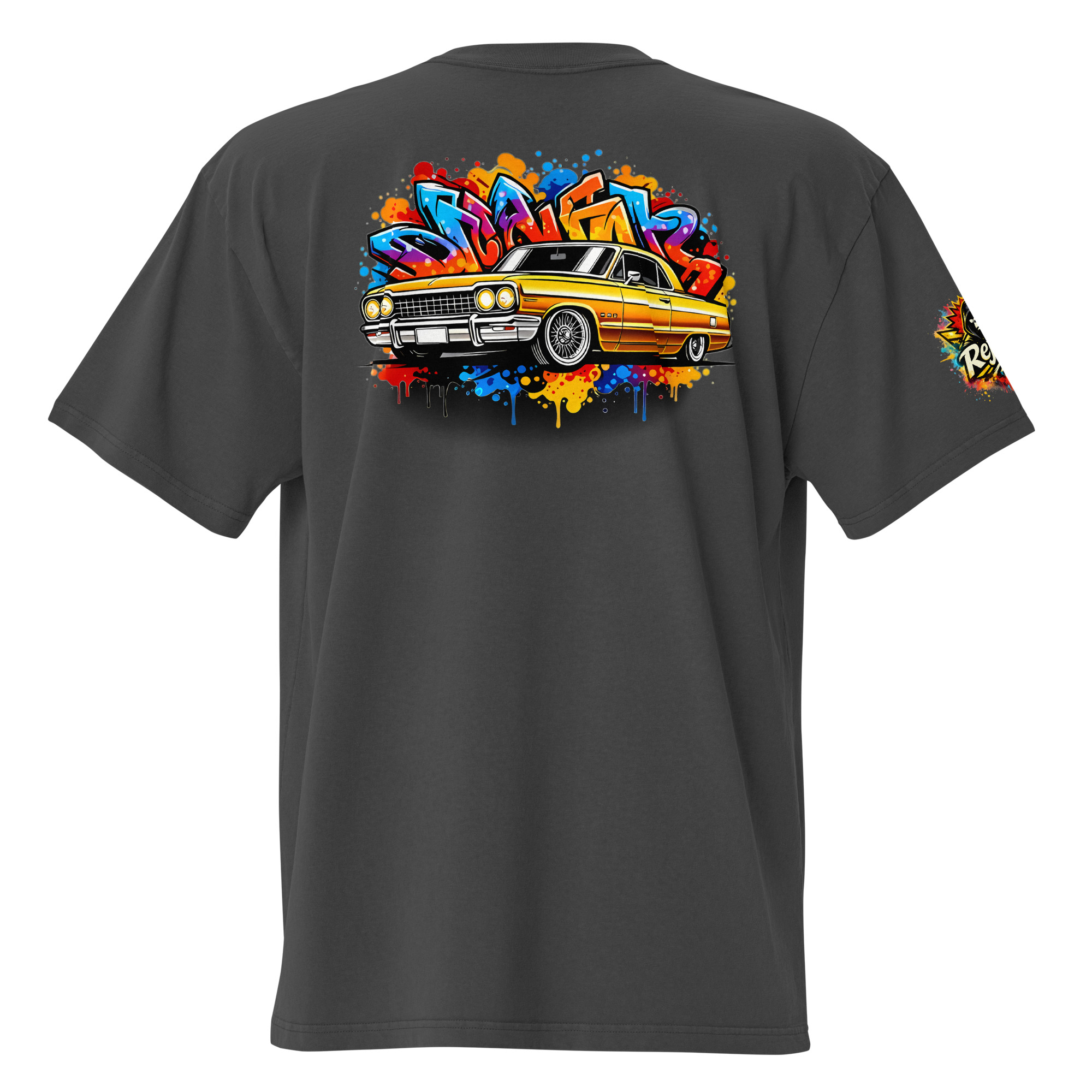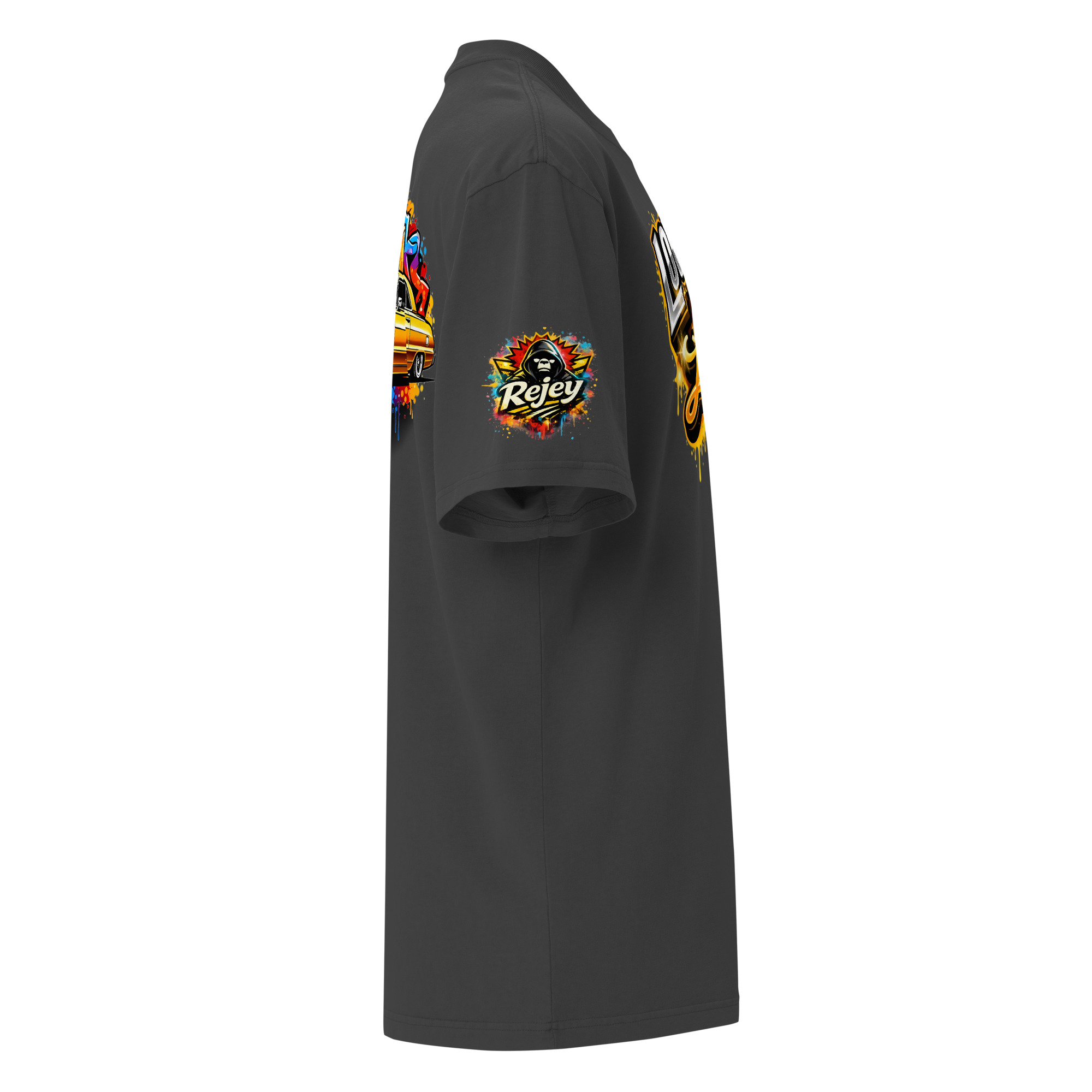The REJEY Lowrider Life Oversized Faded T-Shirt celebrates automotive heritage and West Coast street culture with authentic style. Featuring a bold “LOWRIDER LIFE” graphic on the chest in metallic chrome and gold lettering with graffiti-style drip effects, a vibrant graffiti art lowrider on the back, and REJEY branding on the left sleeve, this tee brings classic car culture to life with modern streetwear edge.