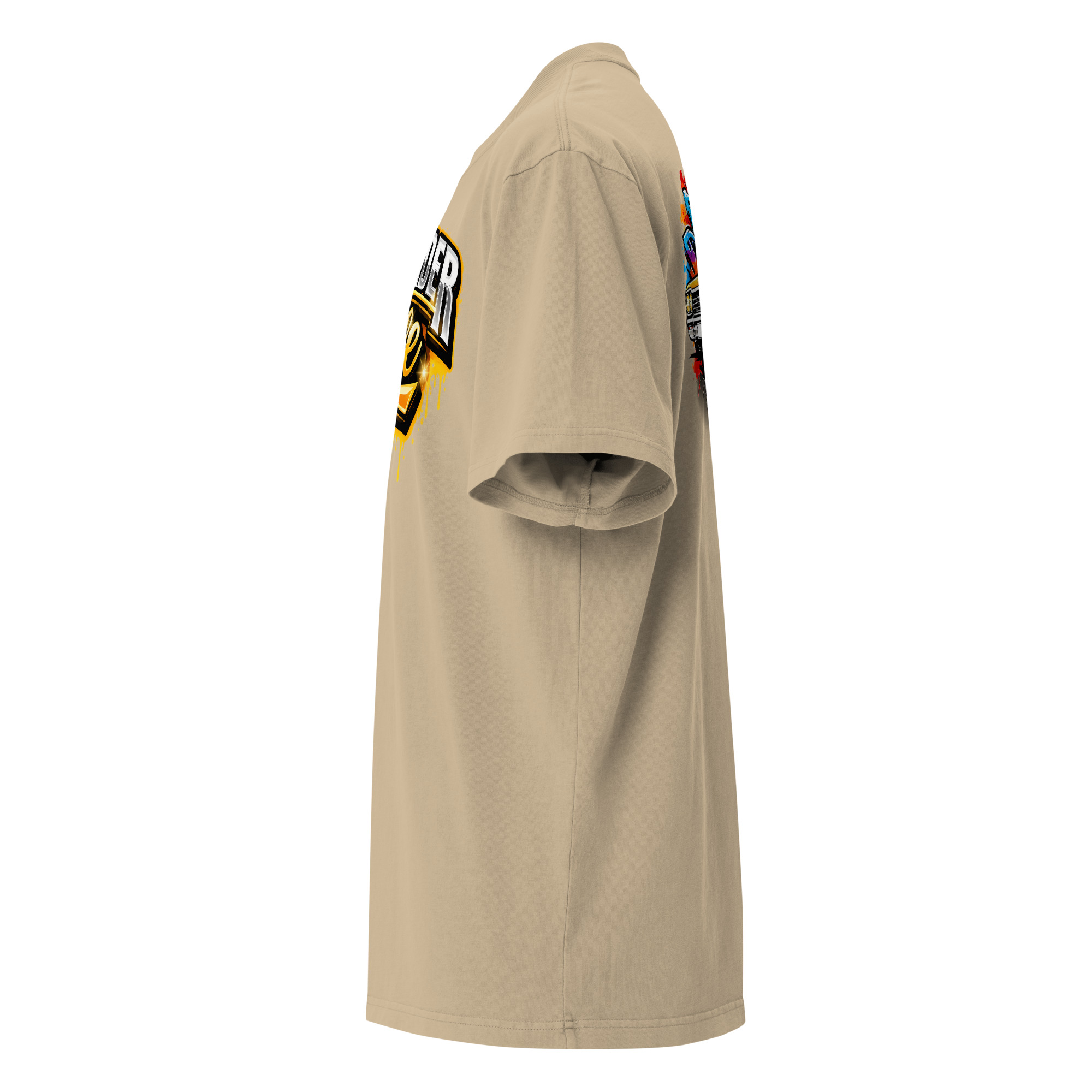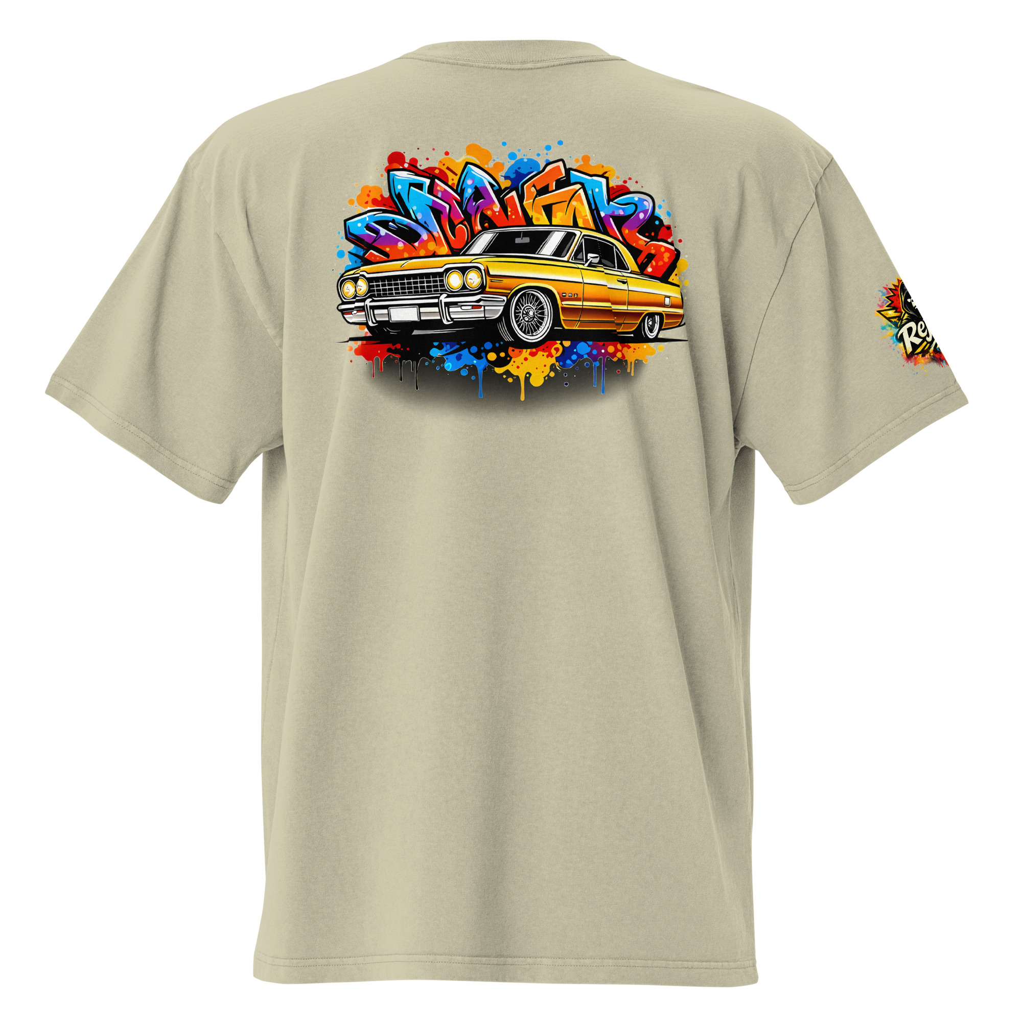 The oversized, boxy fit and garment-dyed fabric deliver that perfectly worn-in vintage feel from day one. Each placement tells a story—the chrome-accented front graphic commands attention, the colorful back showcases a golden lowrider against explosive graffiti art, and the sleeve detail adds subtle brand recognition. This is more than a graphic tee—it’s a tribute to craftsmanship, culture, and cruising with style.