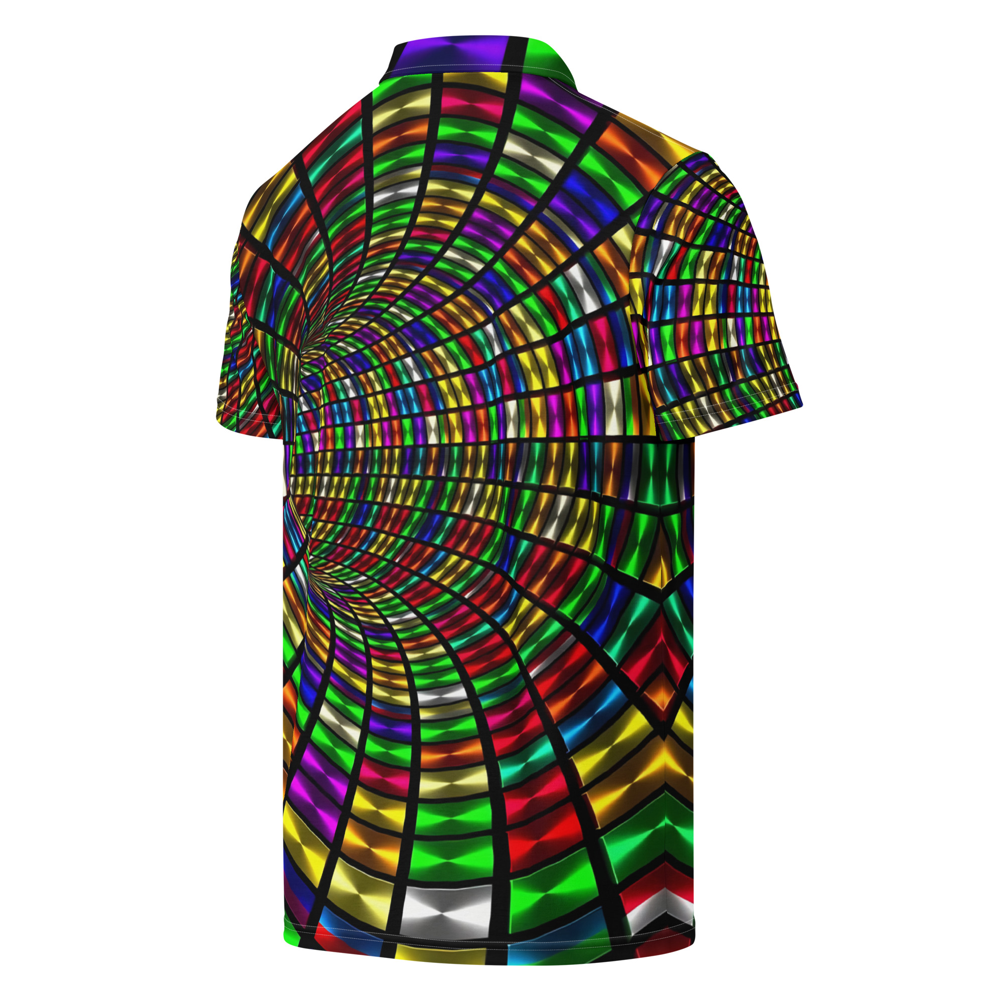 The REJEY Prismatic Depth All-Over Print Men’s Slim Fit Polo Shirt transforms premium casual wear into a visual experience. Featuring an intricate 3D mosaic design in radiant metallic tones—electric greens, vibrant reds, golden yellows, deep purples, and brilliant blues—with a hypnotic spiral pattern, this polo creates the illusion of depth and transparency, as if you’re looking through layers of crystalline color.